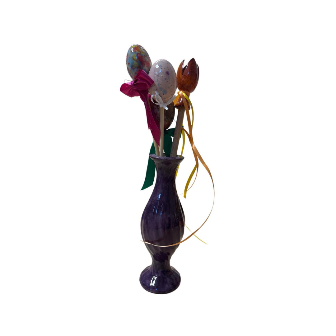 Keramikvase in violett Effektfarbe mit 4 bunte Ostereier Schüssel in bunt
