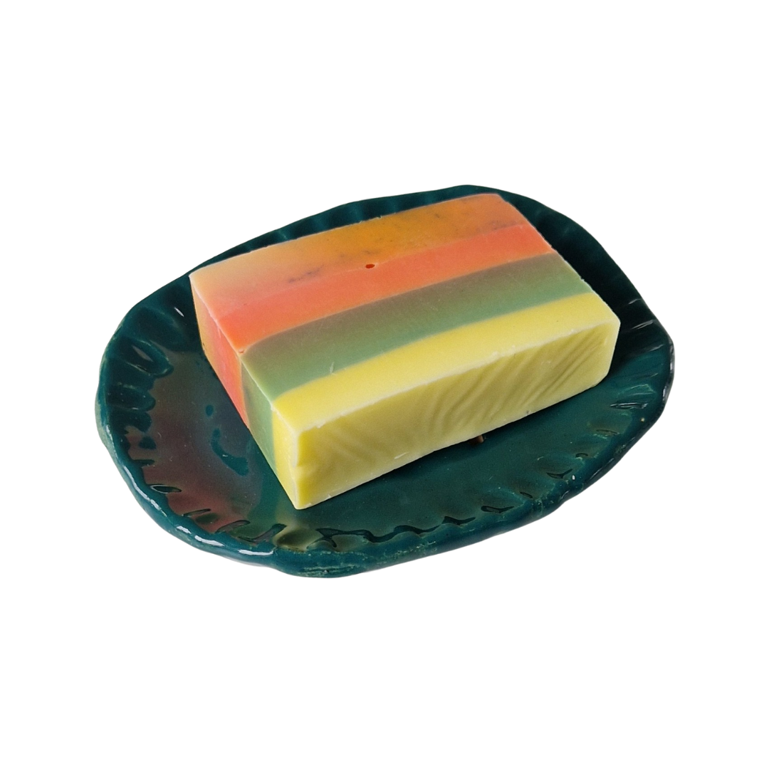 Stylish und bunt zugleich: Die handgefertigte, dunkelgrüne Schale und die farbenfrohe Handseife bilden ein echtes Dreamteam fürs Badezimmer.
