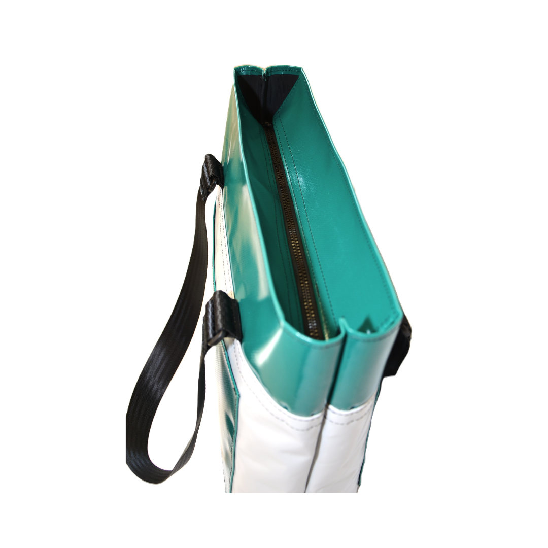 Mit “Greta” mach das Shoppen Spaß! Unser Shopping-Bag “Greta” vereint viel Stauraum mit urbanem Style und Nachhaltigkeit. Die Außenfächer sowie das praktische Innenfach sind mit Reißverschluss ausgestattet. “Greta” wird in Handarbeit aus recycelten Planen hergestellt.