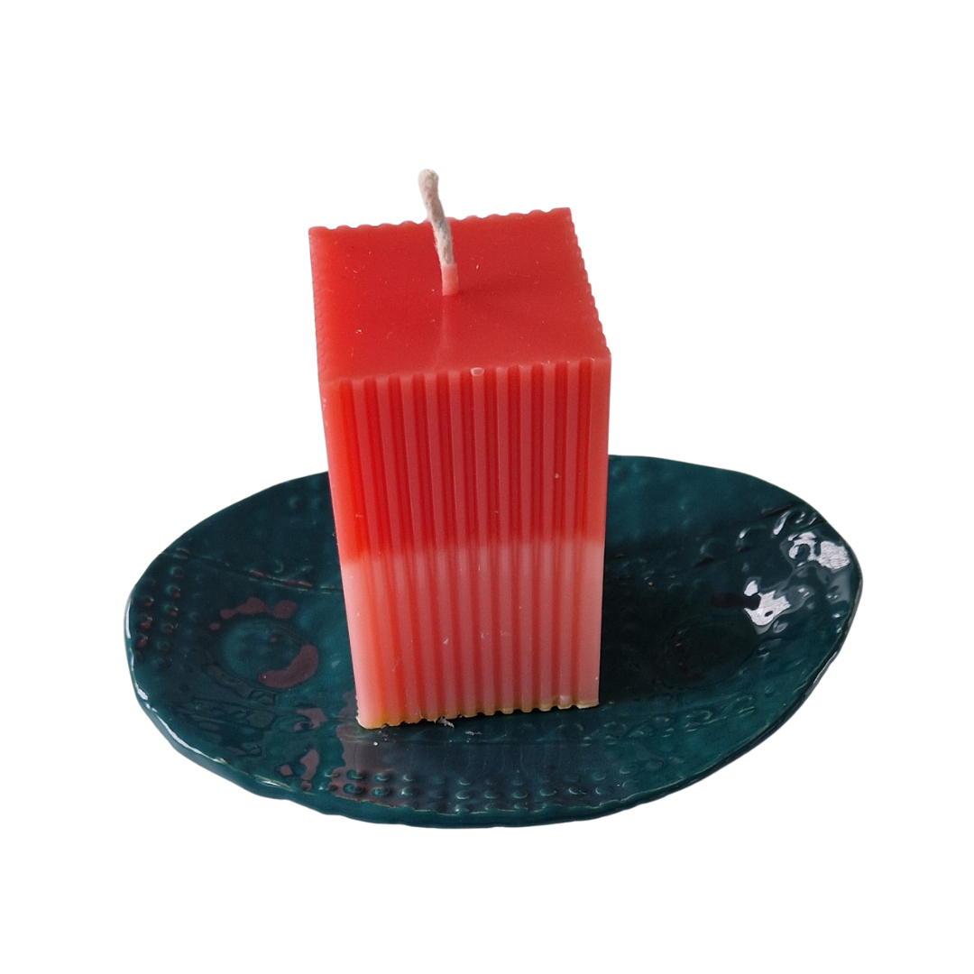 Starkes Duo: Der dunkelgrüne Untersetzer aus Ton und die Kerze in Hell- und Korallrot setzen gemeinsam einen stilvollen Akzent.